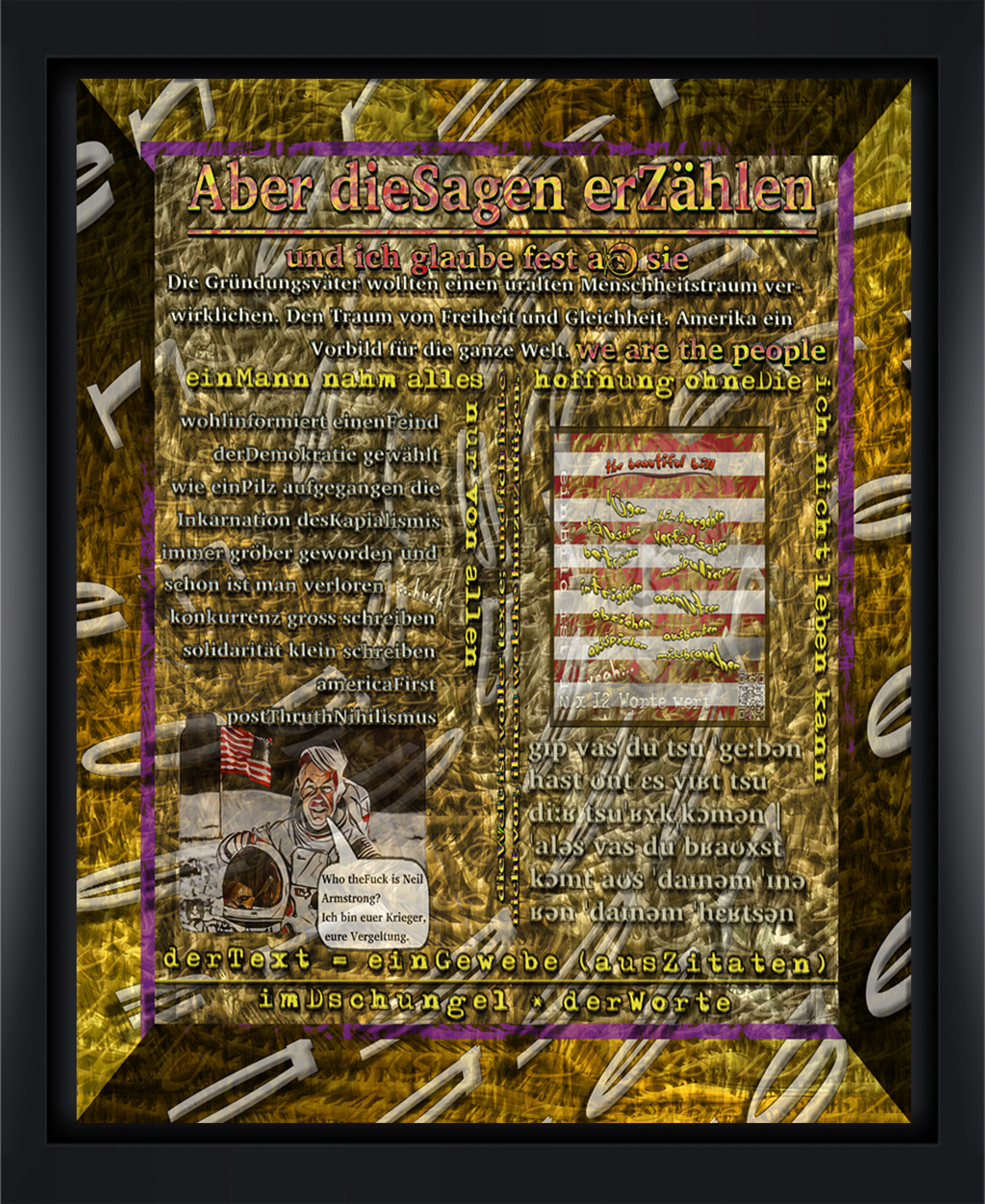 Die gründungsväter wollten einen uralten Menschheitstraum verwirklichen den traum von Freiheit und gleichheit / Amerika ein vorbild für die ganze welt /we are the people / “Ich bin euer krieger eure vergeltung” / die inkarnation des kapitals verkleidet sich als prophet und gewinnt / konkurrenz gross schreiben solidarität klein schreiben / post truth nihilismus